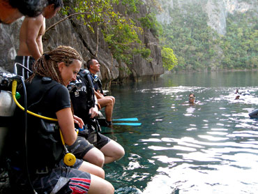The dinghy drops us at the foot of a limestone mountain, where we climb up the wooden stairs, our equipment portaged ahead for us. We pass through the cavity in the stone teeth and descend into Tolkien-world. Barracuda Lake is technically a karst - that's a limestone sinkhole to you and me - the walls run sheer towards jagged battlements piercing the sky, foliage clings on, and for the first time since I stepped aboard the Philippine Siren I can hear birds.