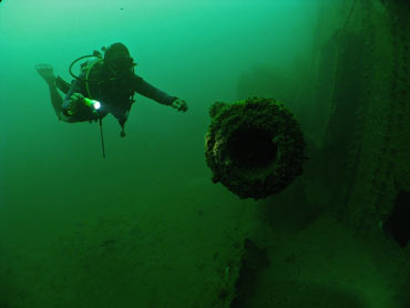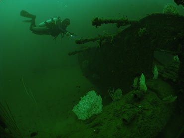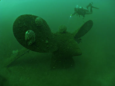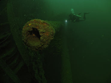 Advanced wreck divers can make the engine room on a set of twin tanks, and the boiler room can be reached on a single. Please note the very visible memorial plaque to the diver who didn’t make it out alive.